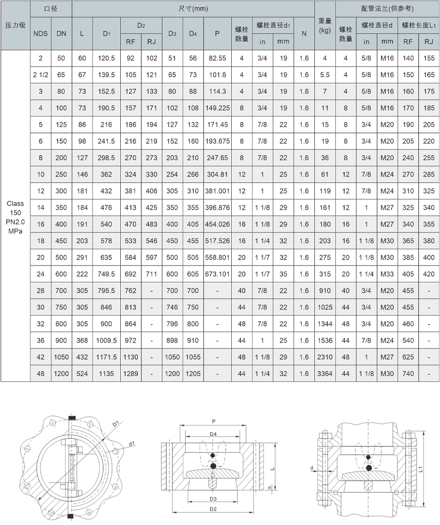 H76鑄造式凸耳式雙瓣旋啟式止回閥主要尺寸及重量
